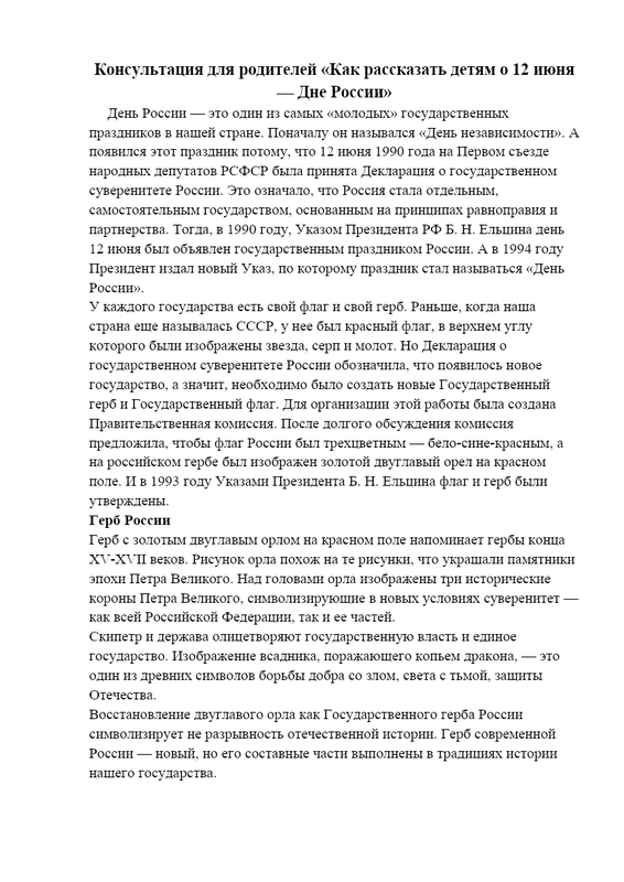 Konsultatsiya Dlya Roditeley Kak Rasskazat Detyam O 12 Iyunya Dne Rossii